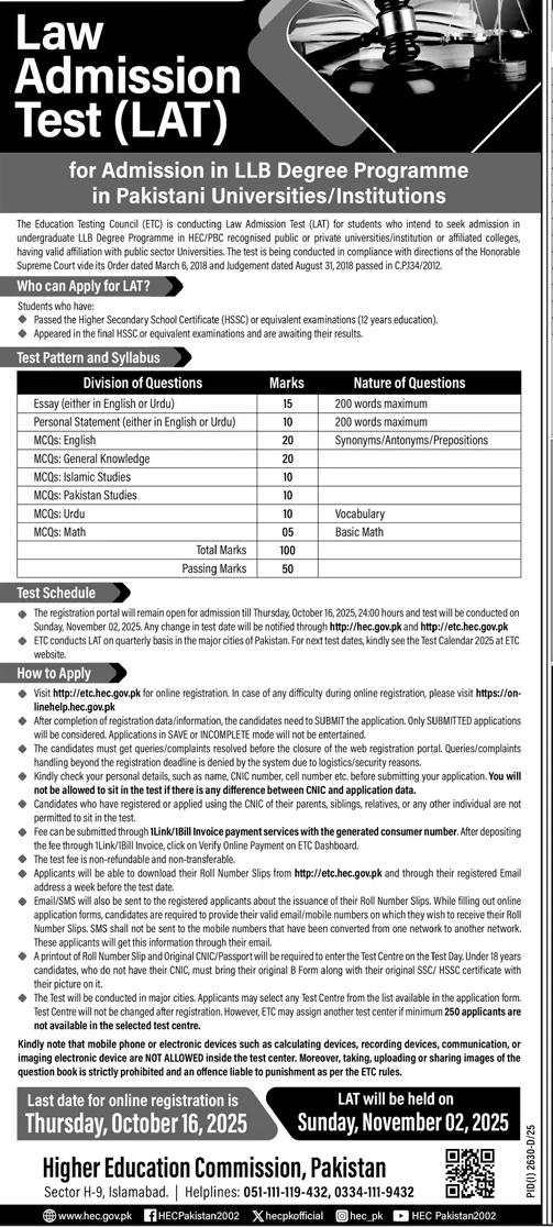 The Education Testing Council (ETC) is conducting Law Admission Test (LAT) for students who intend to seek admission in undergraduate LLB Degree Programme in HEC/PBC recognized public or private universities/institution or affiliated colleges, having valid affiliation with public sector Universities. The test is being conducted in compliance with directions of the Honorable Supreme Court vide its Order dated March 6, 2018 and Judgement dated August 31, 2018 passed in C.PJ34/2012.