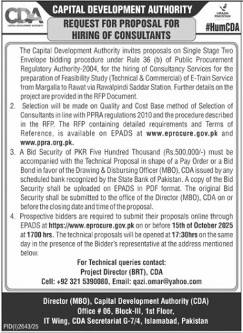 The Capital Development Authority invites proposals on Single Stage Two Envelope bidding procedure under Rule 36 (b) of Public Procurement Regulatory Authority-2004, for the hiring of Consultancy Services for the preparation of Feasibility Study (Technical & Commercial) of E-Train Service from Margalla to Rawat via Rawalpindi Saddar Station. Further details on the project are provided in the RFP Document.