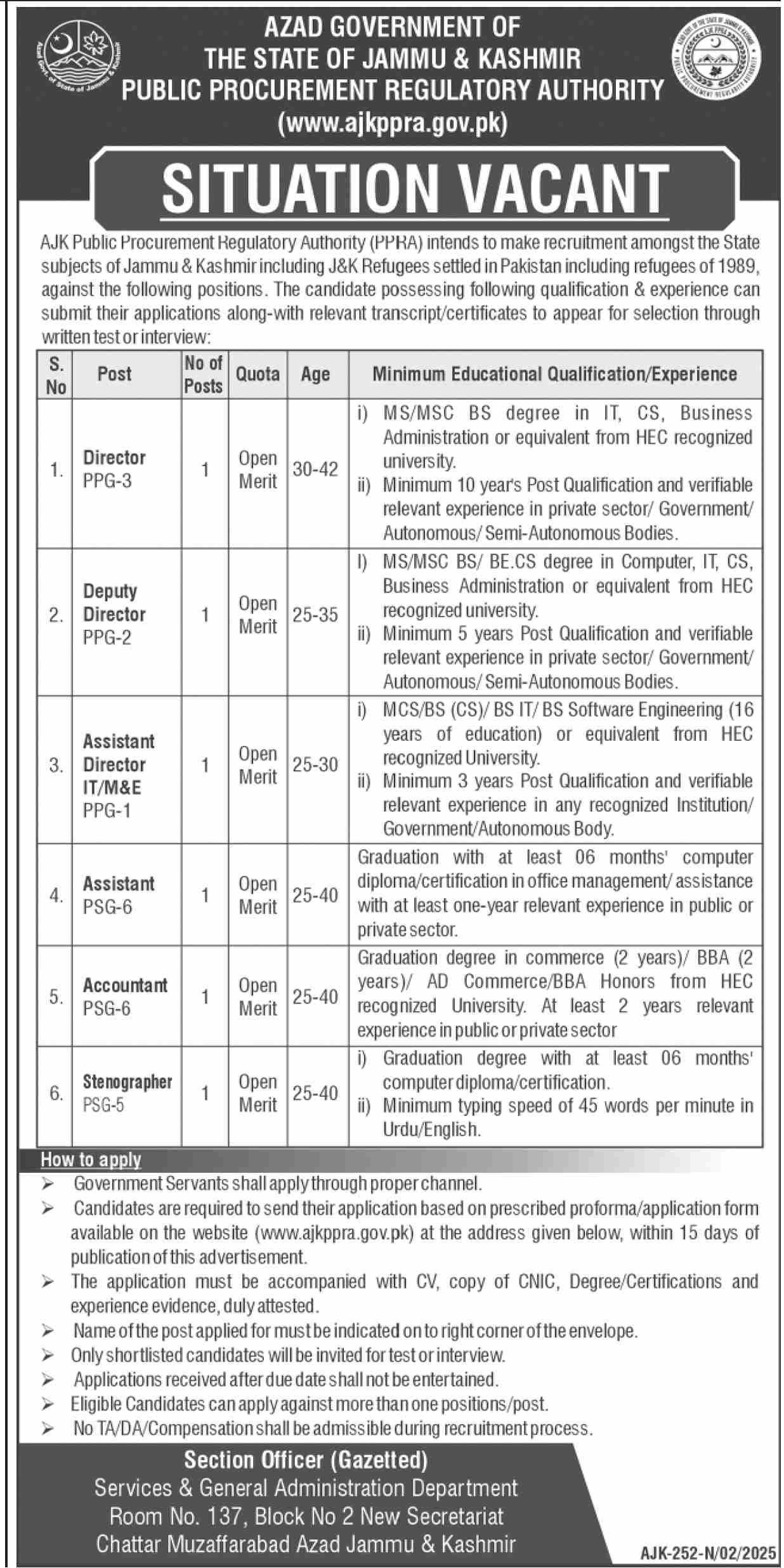 Azad Jammu & Kashmir State AJK Public Procurement Regulatory Authority (PPRA) Jobs of Director, Deputy Driectors, Assistant Directors, Assisants, Accountant and Stenographers opened as advetisement in daily Dawn Newspaper Pakistan jobs ads