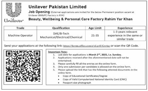 Machine Operator Job opening in Unilever Pakistan Limited Beauty Wellbeing & Personal Factory Rahim Yar Khan advertised in Dawn Newspaper jobs ads Paper Dawn Country Pakistan Province Punjab Sector Private