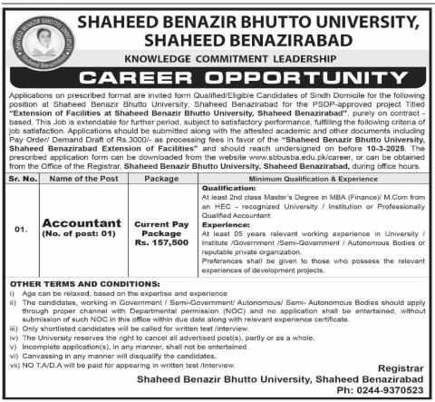 Shaheed Benazir Bhutto University, Shaheed Benazirabad Career Oppurtunities are opened as Accountants Jobs in Dawn newspaper ads.