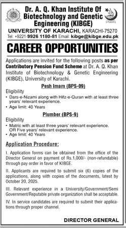 Applications are invited for the following posts as per Contributory Pension Fund Scheme at Dr. A. Q. Khan Institute of Biotechnology & Genetic Engineering (KIBGE). University of Karachi.
