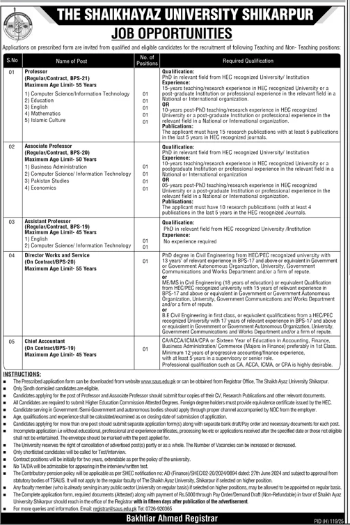 The THE SHAIKHAYAZ UNIVERSITY SHIKARPUR require Applications on prescribed form are invited from qualified and eligible candidates for the recruitment of following Teaching and Non- Teaching positions: