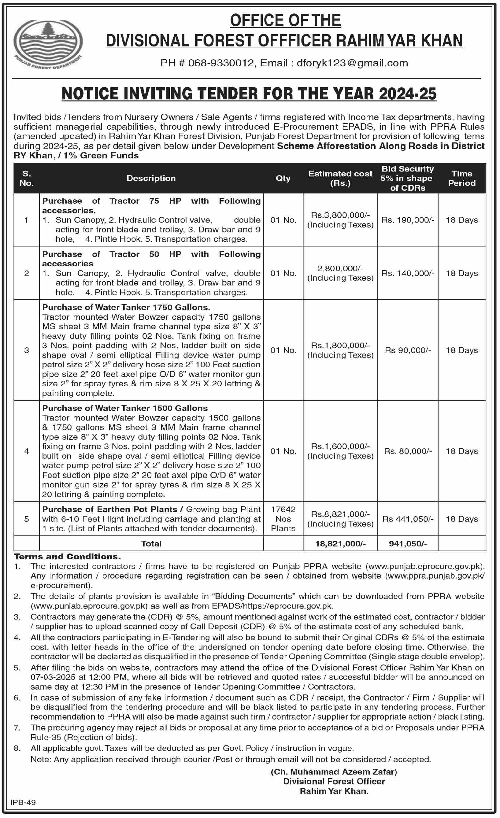 After filing the bids on website, contractors may attend the office of the Divisional Forest Officer Rahim Yar Khan on