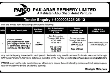 Pak-Arab Refinery Limited (PARCO) , A Pakistan Abu-Dhabi Joint Venture Tender Inquiry # 6000008225-25-12 Ad Image Paper Jang Province Sindh City Karachi