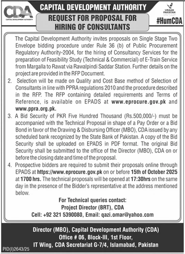 The Capital Development Authority invites proposals on Single Stage Two Envelope bidding procedure under Rule 36 (b) of Public Procurement Regulatory Authority-2004, for the hiring of Consultancy Services for the preparation of Feasibility Study (Technical & Commercial) of E-Train Service from Margalla to Rawat via Rawalpindi Saddar Station. Further details on the project are provided in the RFP Document.