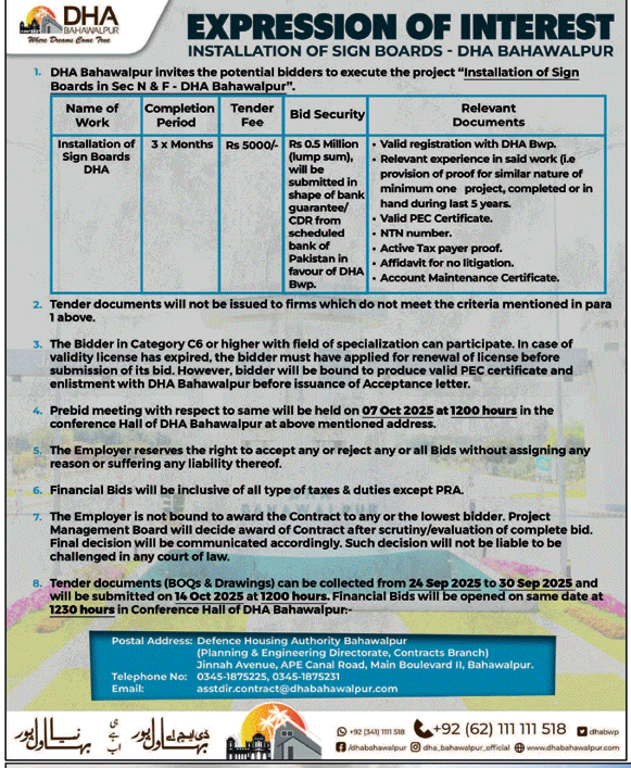 Defense Housing Authority DHA Bahawalpur invites the potential bidders to execute the project "Installation of Sign Boards in Sec N&F-DHA Bahawalpur" Ad Image Paper Nawaiwaqt Province Punjab City Bahawalpur