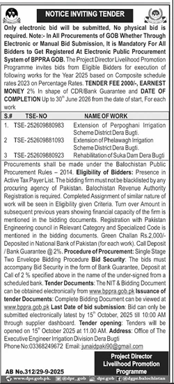 Only electronic bid will be submitted, No physical bid is required. Note:- In All Procurements of GOB Whether Through Electronic or Manual Bid Submission, It is Mandatory For All Bidders to Get Registered At Electronic Public Procurement System of BPPRA GOB. The Project Director Livelihood Promotion Programme invites bids from Eligible Bidders for execution of following works for the Year 2025 based on Composite schedule rates 2023 on Percentage Rates, TENDER FEE 2000/-, EARNEST MONEY 2% In shape of CDR/Bank Guarantee and DATE OF OMPLETION Up to 30* June 2026 from the date of start, For each work