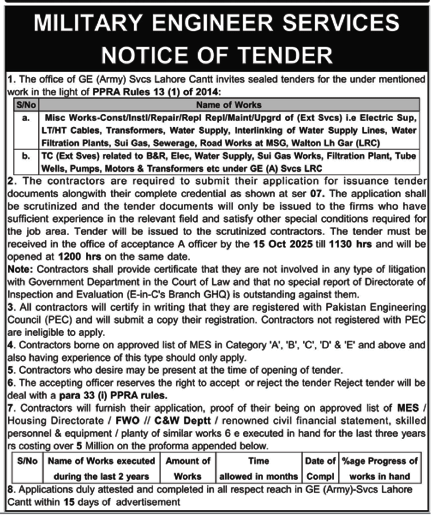 1. The office of GE (Army) Svos Lahore Cantt invites sealed tenders for the under mentioned work in the light of PPRA Rules 13 (J) of 2014 Ad Image Paper Nawaiwaqt Province Punjab City Rawalpindi