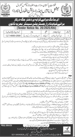 اى بذّنك برانى كرايه پردفتر/جكه دركار بران قيام نادرار جستريشن سينتر، بحريه تانون (Tender Notice No. 20/2025/Khi) Ad Image Paper Jang Province Sindh City Karachi Sector Government