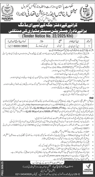National Database and Registration Authority NADRA Pakistan Matiari office new placement Tender