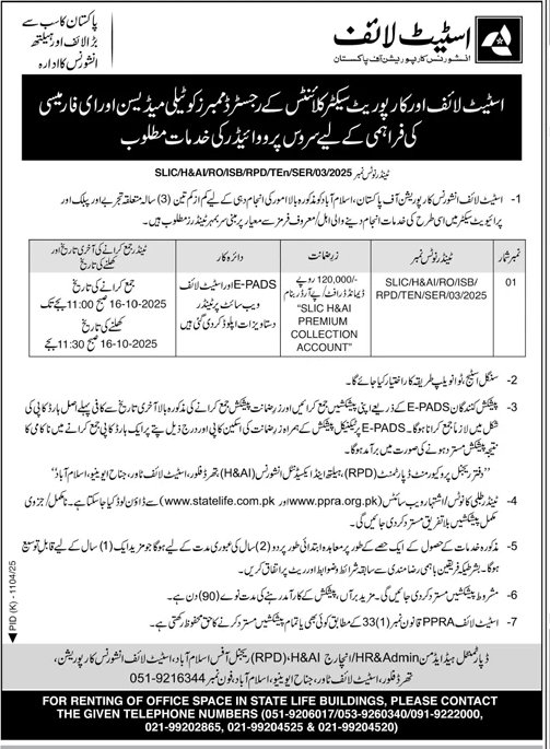 State Life Insurance Corporation Pakistan Tender Open for Tele medicine and e-pharmacy