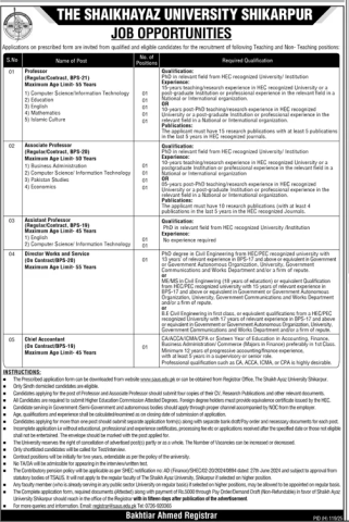 The THE SHAIKHAYAZ UNIVERSITY SHIKARPUR require Applications on prescribed form are invited from qualified and eligible candidates for the recruitment of following Teaching and Non- Teaching positions: