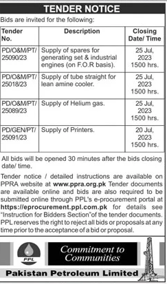 Pakistan Petrolium Limited PPL Tender for Spares for Engines, Hellium Gas and Printers